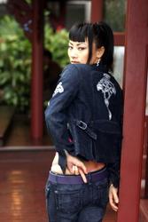 Bai Ling wearing a nice pink g-string, and giving us the finger.