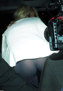 Celeb Jenny Frost gets caught by the flash photography of the paparazzi, revealing her white thong through her sheer black pants. Good work paparazzi!